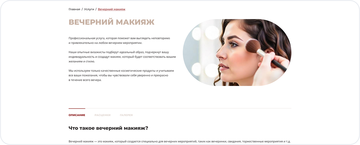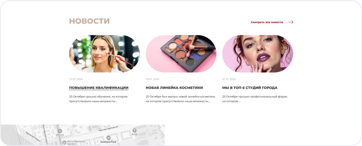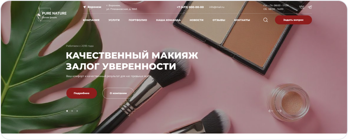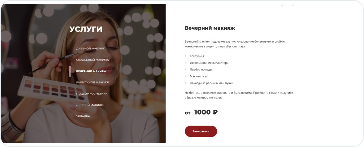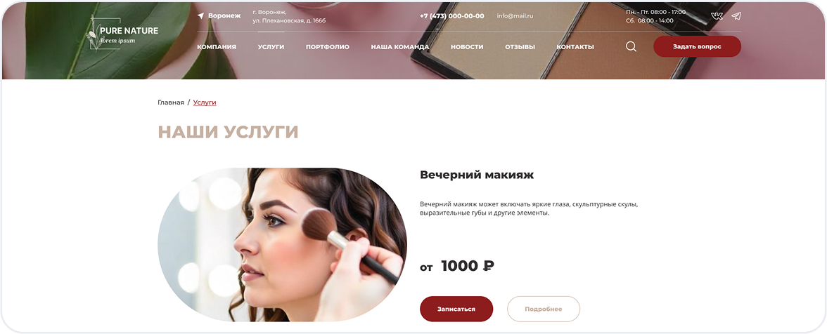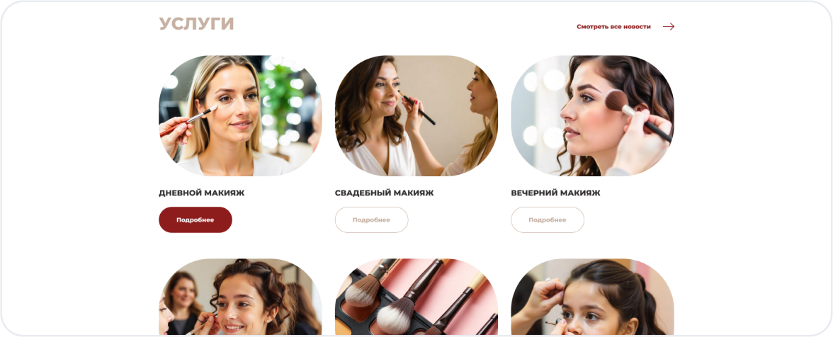 Первое впечатление решает всё. Главная страница встречает посетителя стильным дизайном, кратко рассказывает о ваших услугах и содержит понятный призыв к действию — онлайн-запись.
