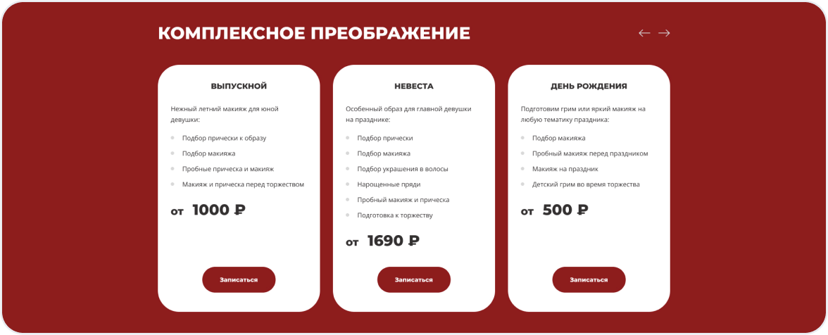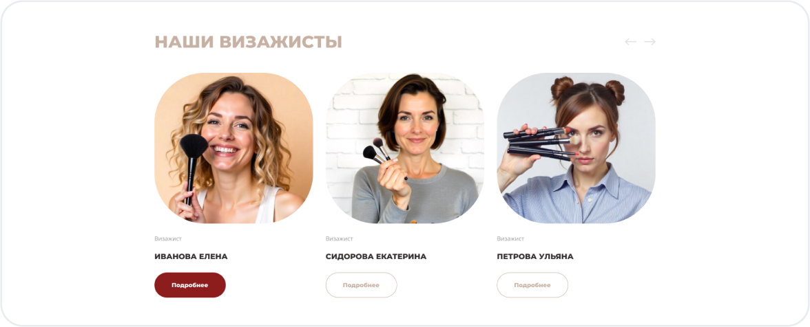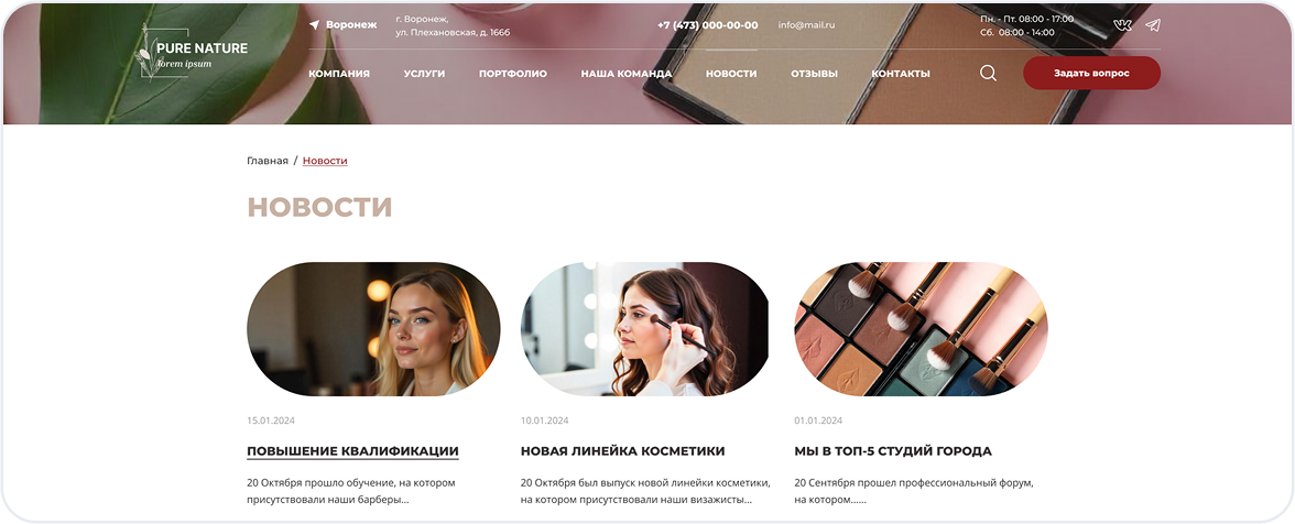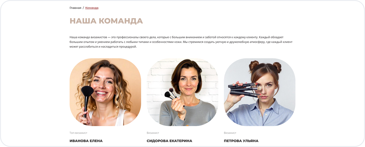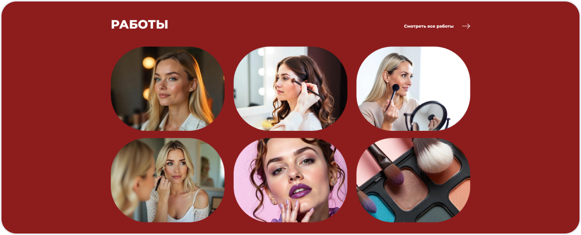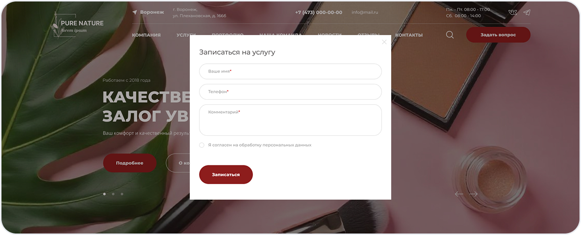 Первое впечатление решает всё. Главная страница встречает посетителя стильным дизайном, кратко рассказывает о ваших услугах и содержит понятный призыв к действию — онлайн-запись.