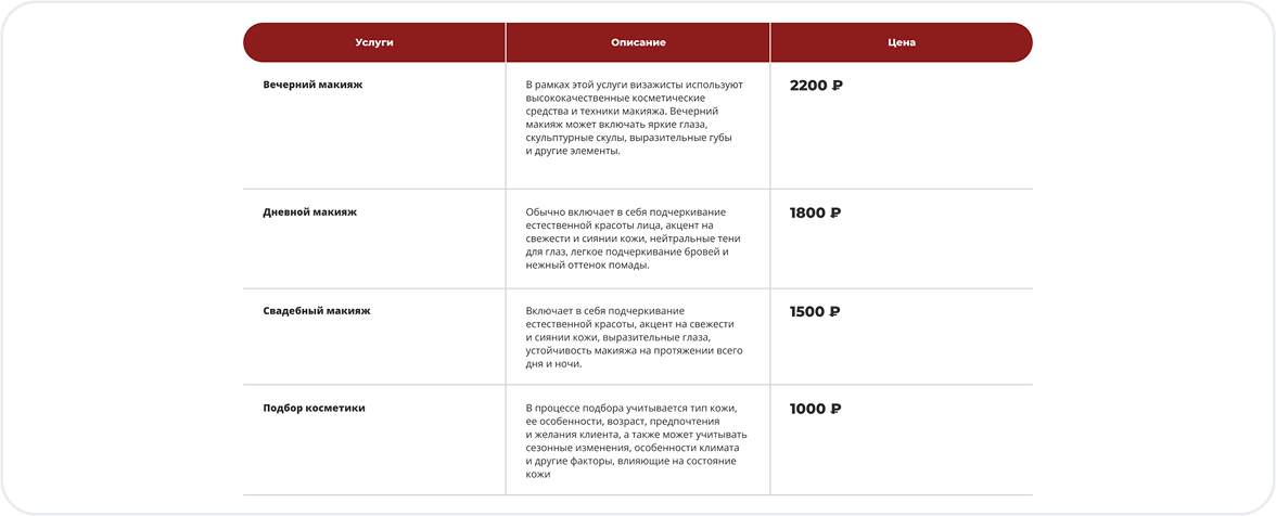 Структурированный каталог помогает клиентам легко ориентироваться в процедурах. Каждая услуга снабжена описанием, фотографиями и ценой, что повышает конверсию и облегчает выбор.