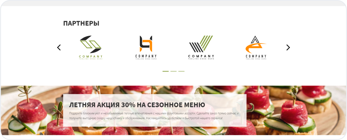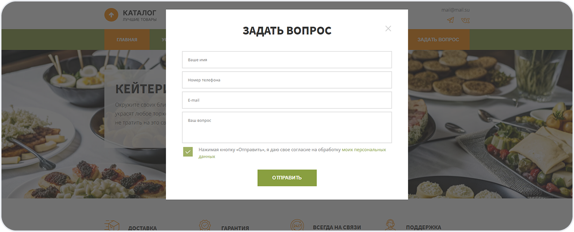Готовый сайт кейтеринга можно запустить уже через неделю. В стоимость входит:
