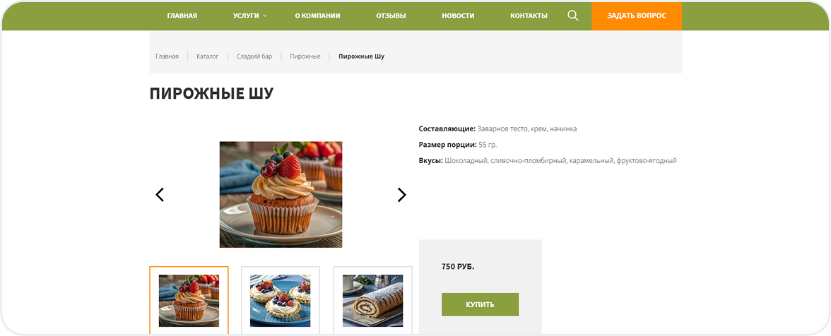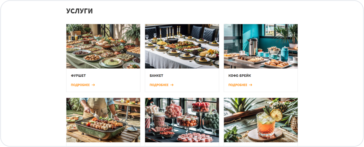 Услуги — кейтеринг для свадеб, конференций, корпоративов, кофе-брейков.