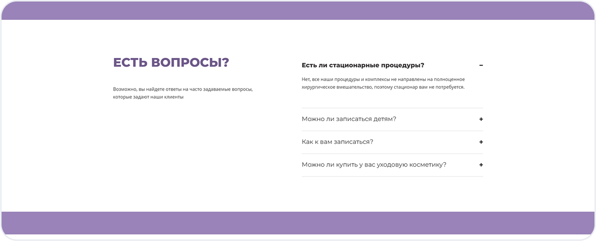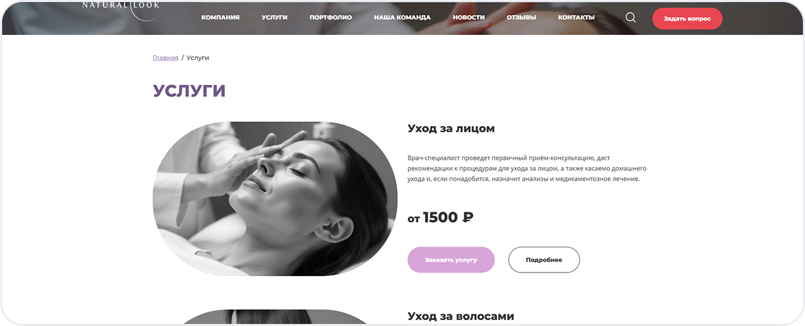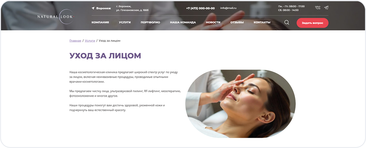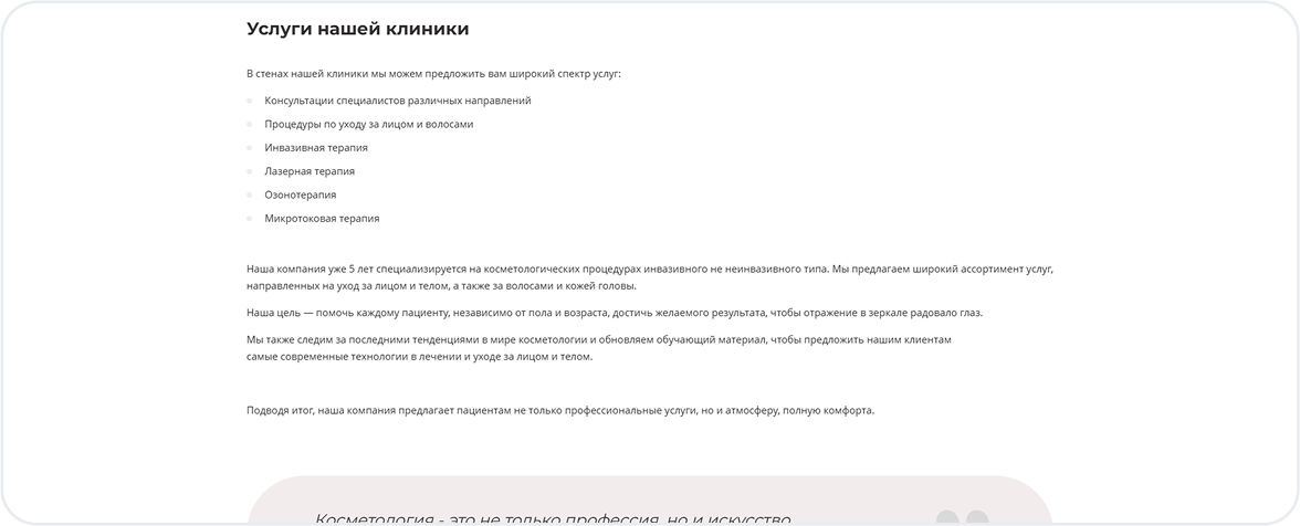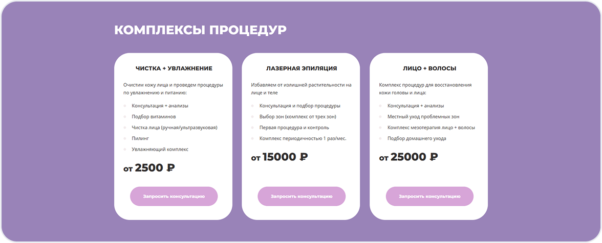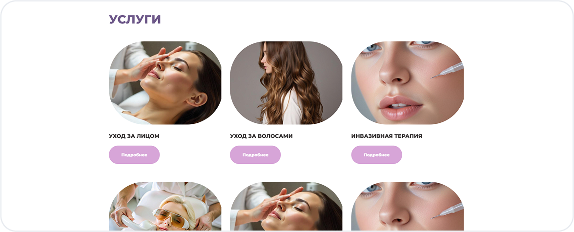 страницы для отдельных процедур (ботокс, пилинг, лазерная эпиляция и т.д.);