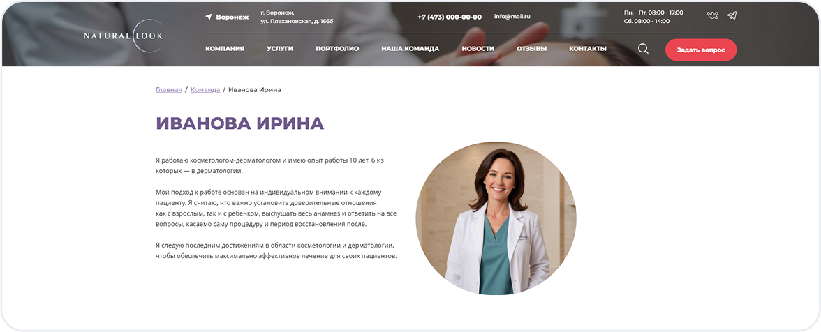 Раздел «О клинике» — история, философия бренда, лицензии и сертификаты;