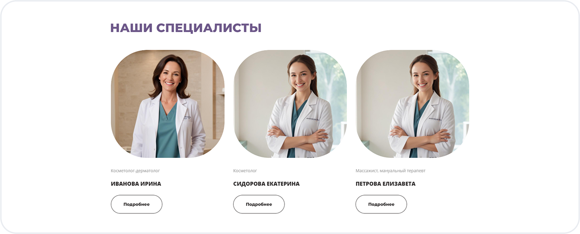 Страница «Специалисты» — карточки врачей с фото, стажем и отзывами;