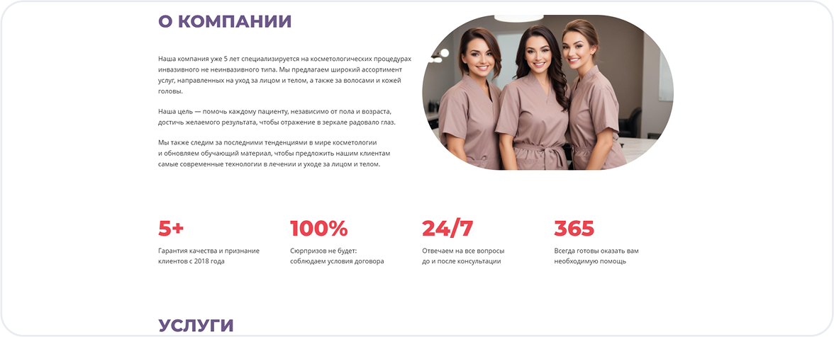 Главная страница с акцентом на УТП, отзывы и блок “до/после”;