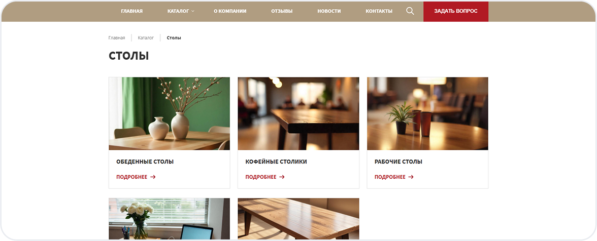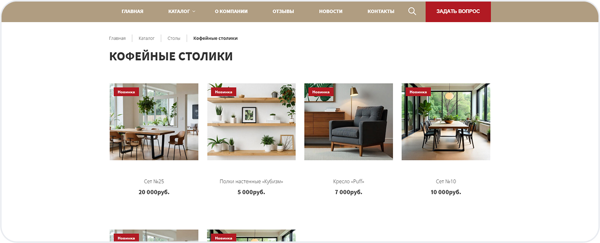 Каталог мебели с удобной фильтрацией по типу, материалу, стилю, цвету и размерам.