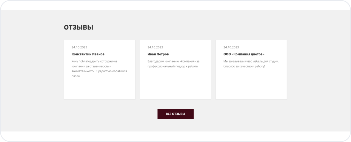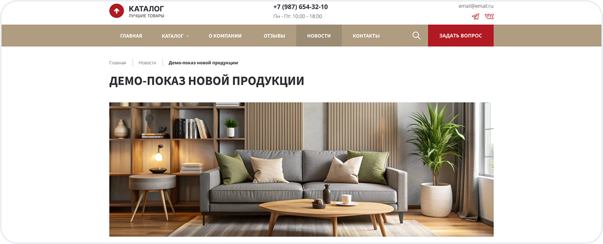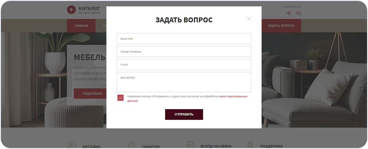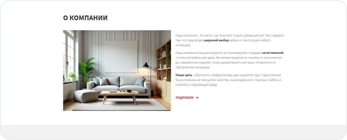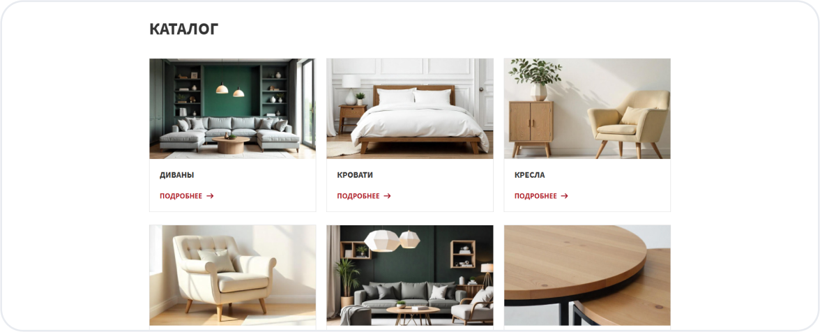 Калькулятор или онлайн-конструктор (опционально) — для расчёта кухни или шкафа-купе прямо на сайте.