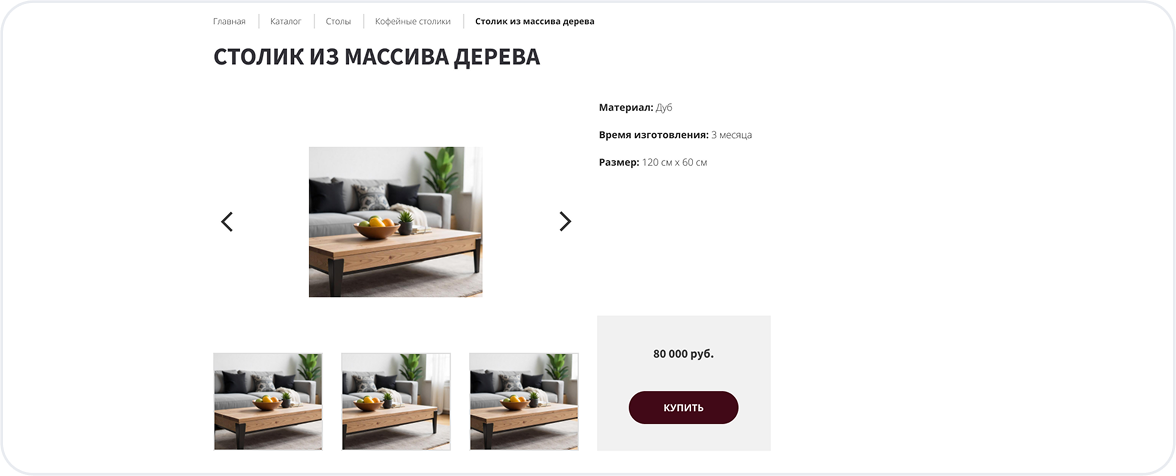 Карточки товаров с описаниями, характеристиками, ценами и галереей изображений.