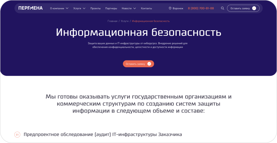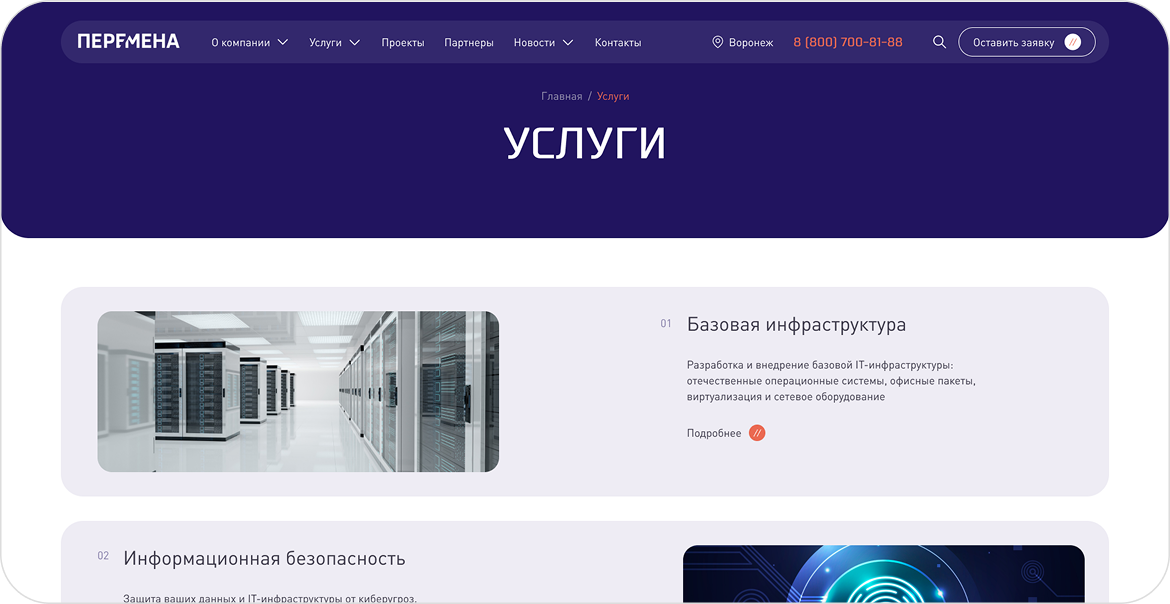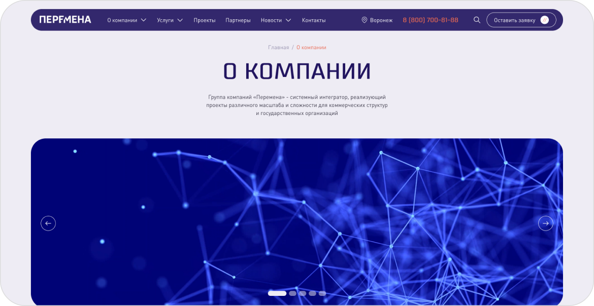 В рамках проекта для группы компаний «Перемена» мы разработали корпоративный сайт как управляемый цифровой инструмент, а не просто витрину услуг. Основная ценность для клиента — перевод позиционирования системного интегратора в чёткую, структурированную и понятную для B2B-аудитории онлайн-среду.