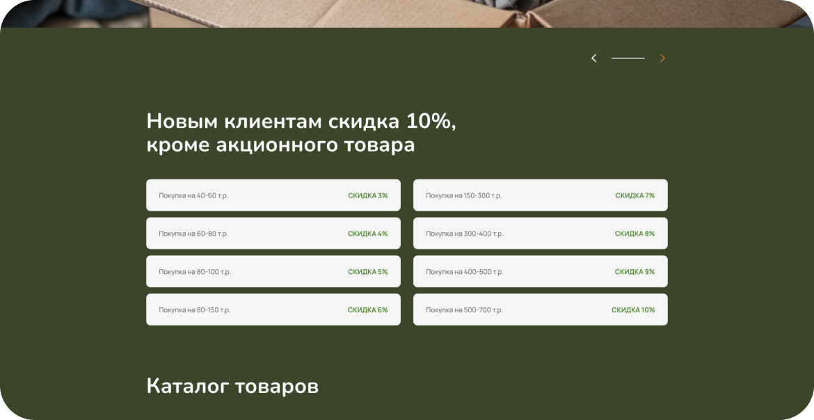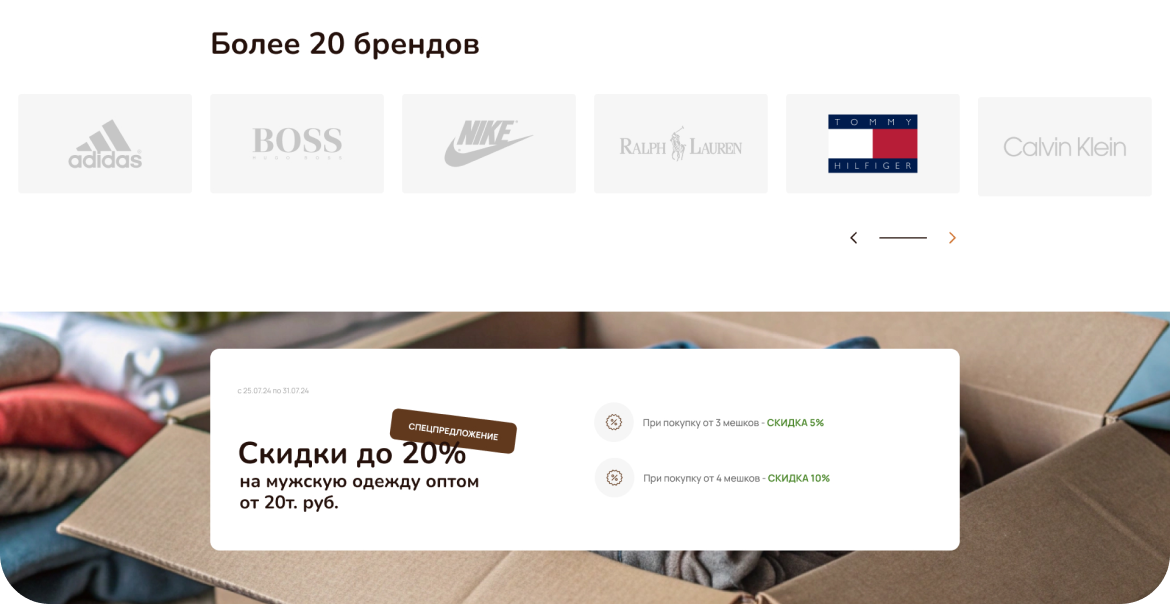 Отдельное внимание уделено подаче информации о скидках, поставках и преимуществах. Ключевые условия работы, акции и обновления ассортимента вынесены в отдельные блоки, благодаря чему пользователь сразу видит выгоду и актуальность предложений.