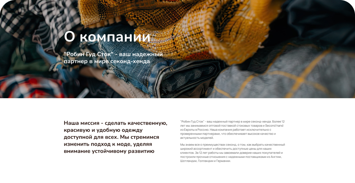 Компания «Робин Гуд Сток» — поставщик секонд-хенд и сток одежды оптом. Основная задача проекта заключалась в создании современного сайта с каталогом и прайс-листом, который упрощает работу с ассортиментом и помогает быстро ориентироваться в поставках для оптовых клиентов.