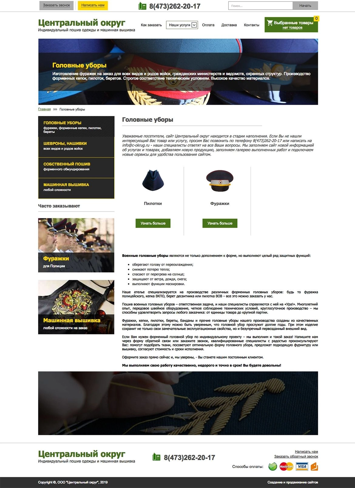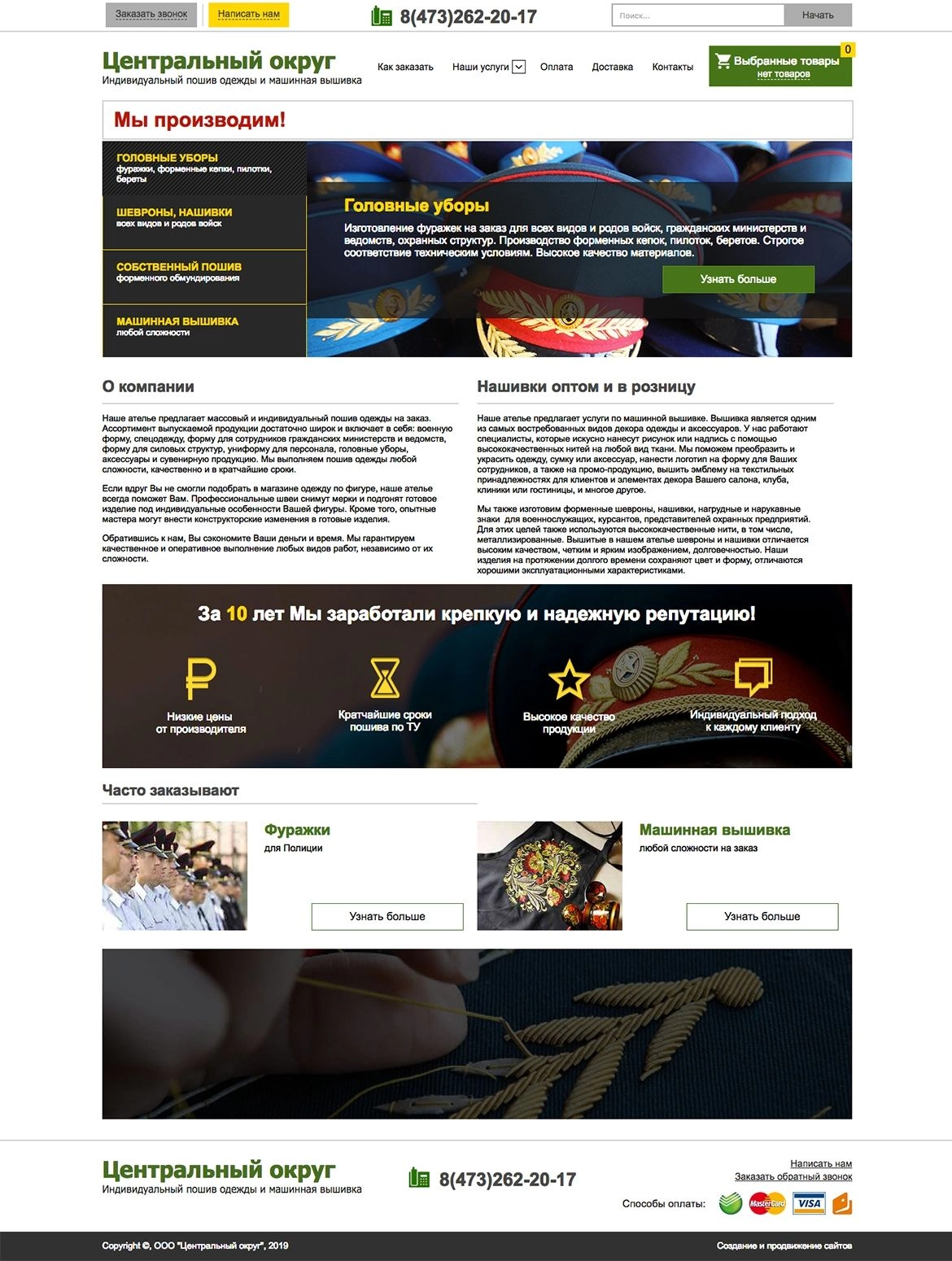 Нам хотелось показать, что сайт для военного ателье может быть интересным и стильным! Конечно же, необходимо было продемонстрировать все модели формы и услуги, оказываемые компанией «Центральный округ».